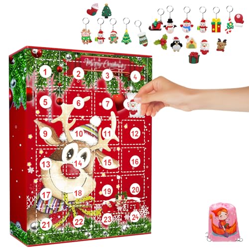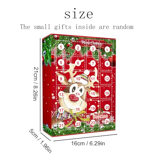 Inhoud van de verpakking: 1 stuks * Kerstadventskalender (de 24 stijlen binnenin zijn willekeurig, de sleutelhangers variëren afhankelijk van de verschillende stijlen, sommige stijlen hebben sleutelhangers en sommige stijlen hebben geen sleutelhangers) + 1 verpakkingstas (patroon zoals weergegeven in de afbeelding)
